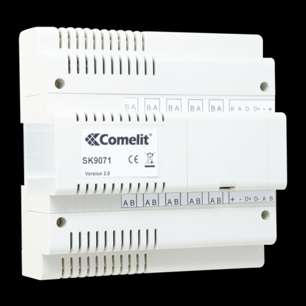 The Comelit 4399 power supply (6 DIN modules) provides an adjustable 12VDC-4A output with a durable white plastic casing, designed for access control systems and code keypads.