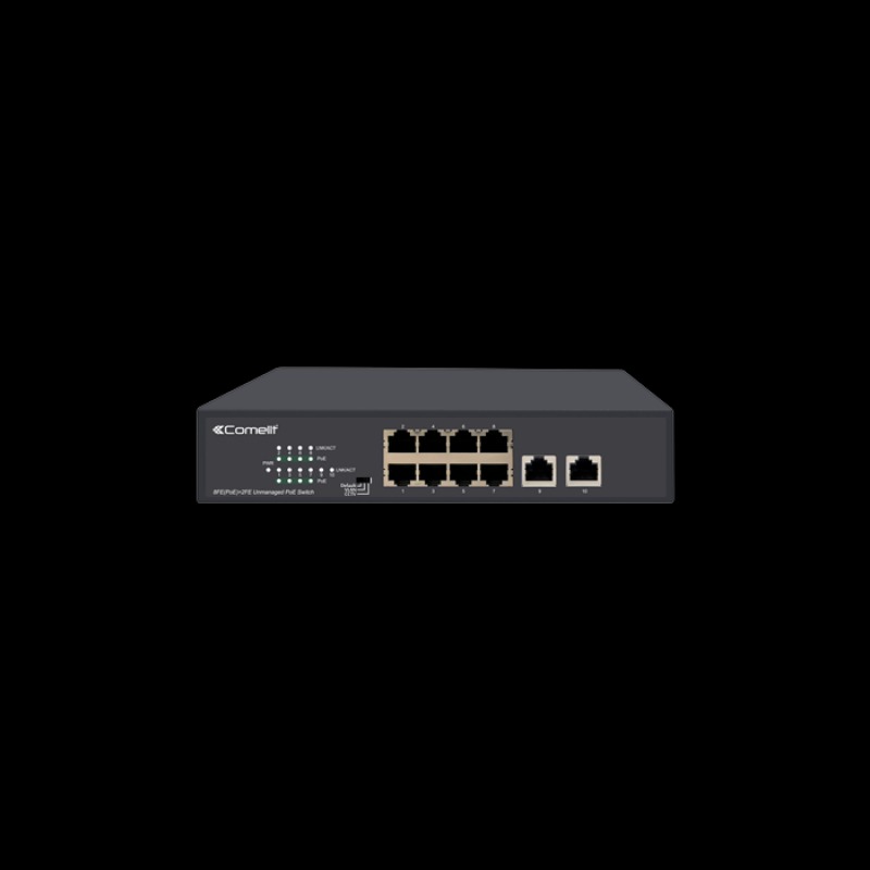 Thiết bị chuyển mạch vỏ kim loại gồm 8 cổng PoE và 2 cổng Uplink, hỗ trợ tổng công suất 120W, truyền dẫn xa và dễ dàng lắp đặt gắn tường.